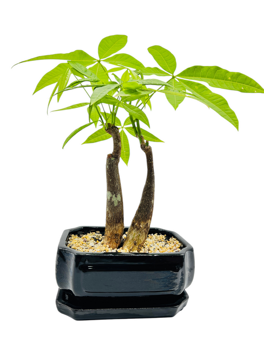 5 Leaves Twin Trunk Indoor Guiana Chestnut “Pachira Aquatica” Bonsai Tree With Saucer 8 Inch 发财树