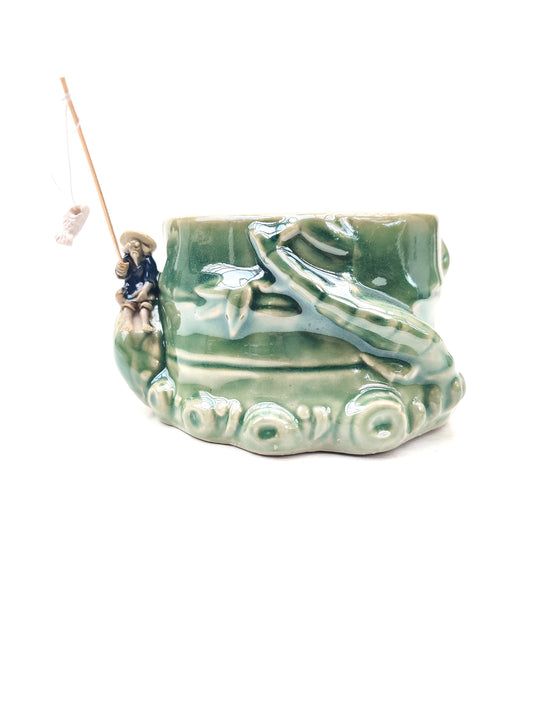 5" Bamboo Bonsai Pot With Fisherman Ornament
