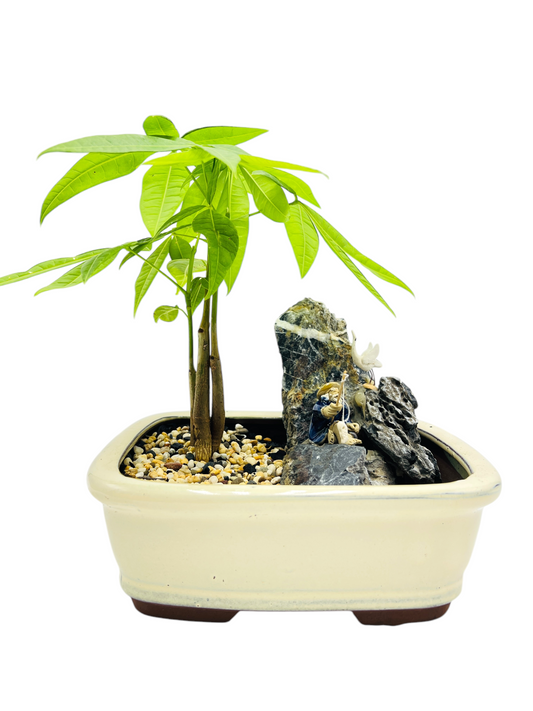 Rock Feature Triple Trunk Indoor Guiana Chestnut “Pachira Aquatica” Bonsai Tree 8 Inch 发财树