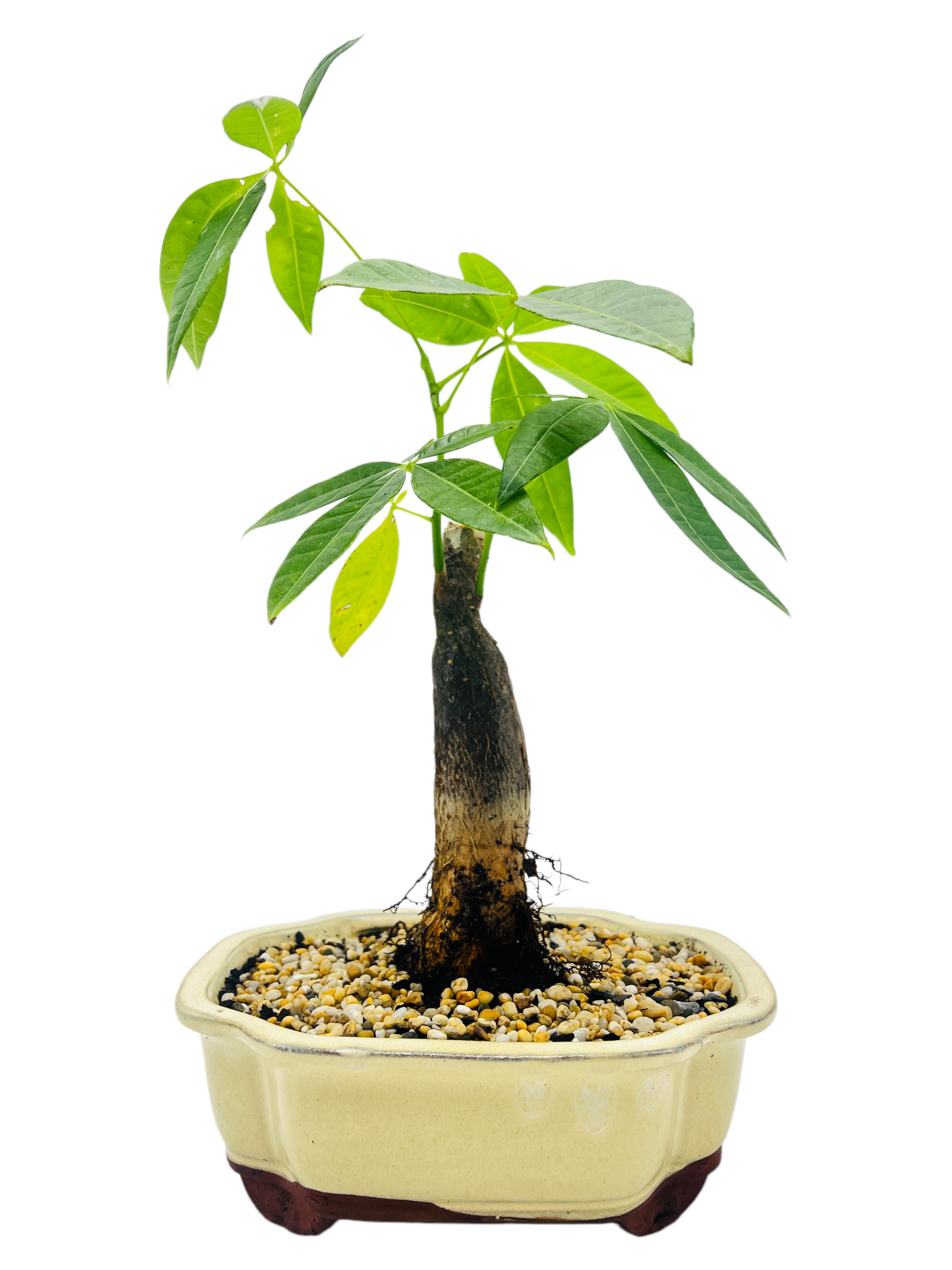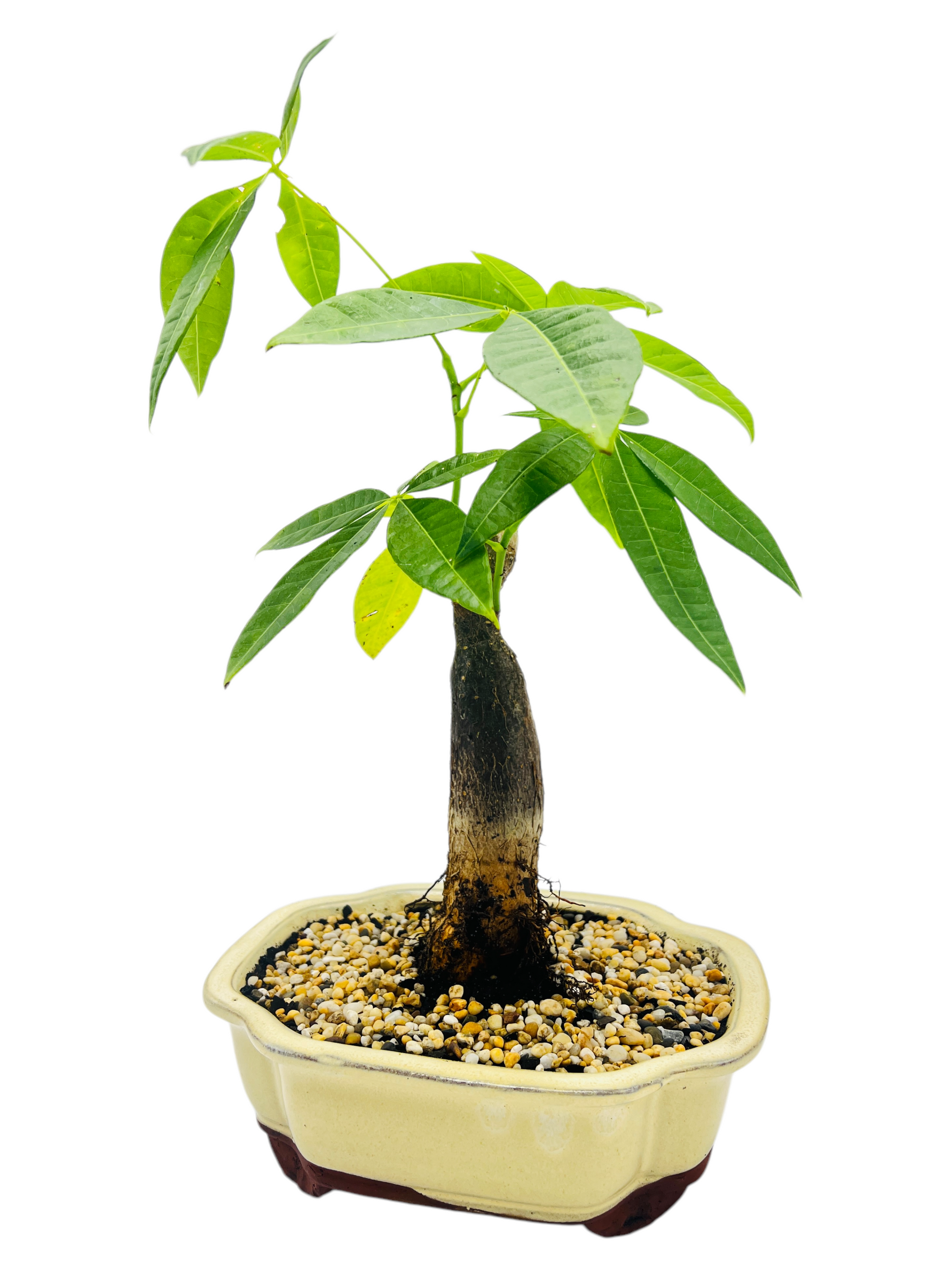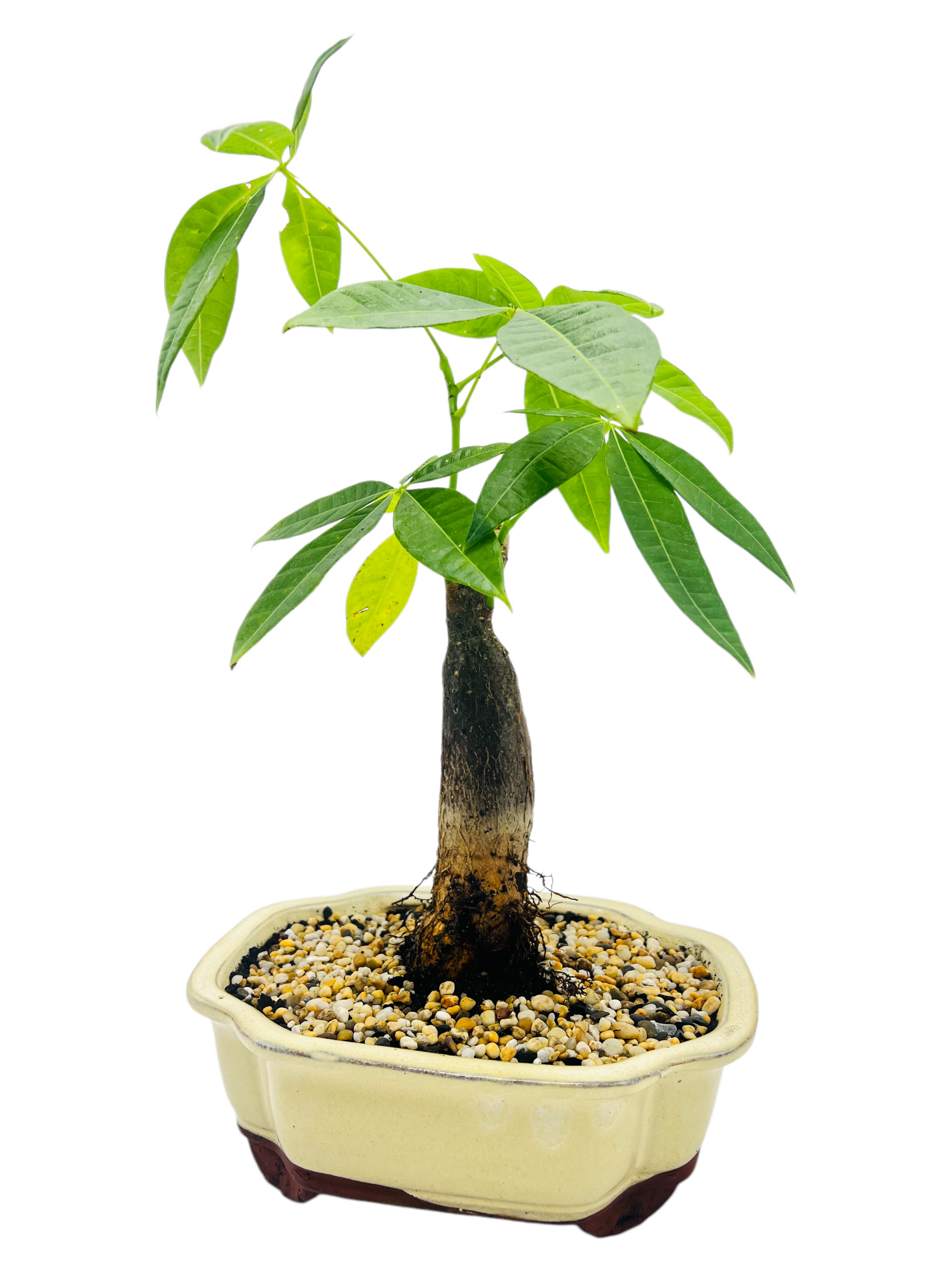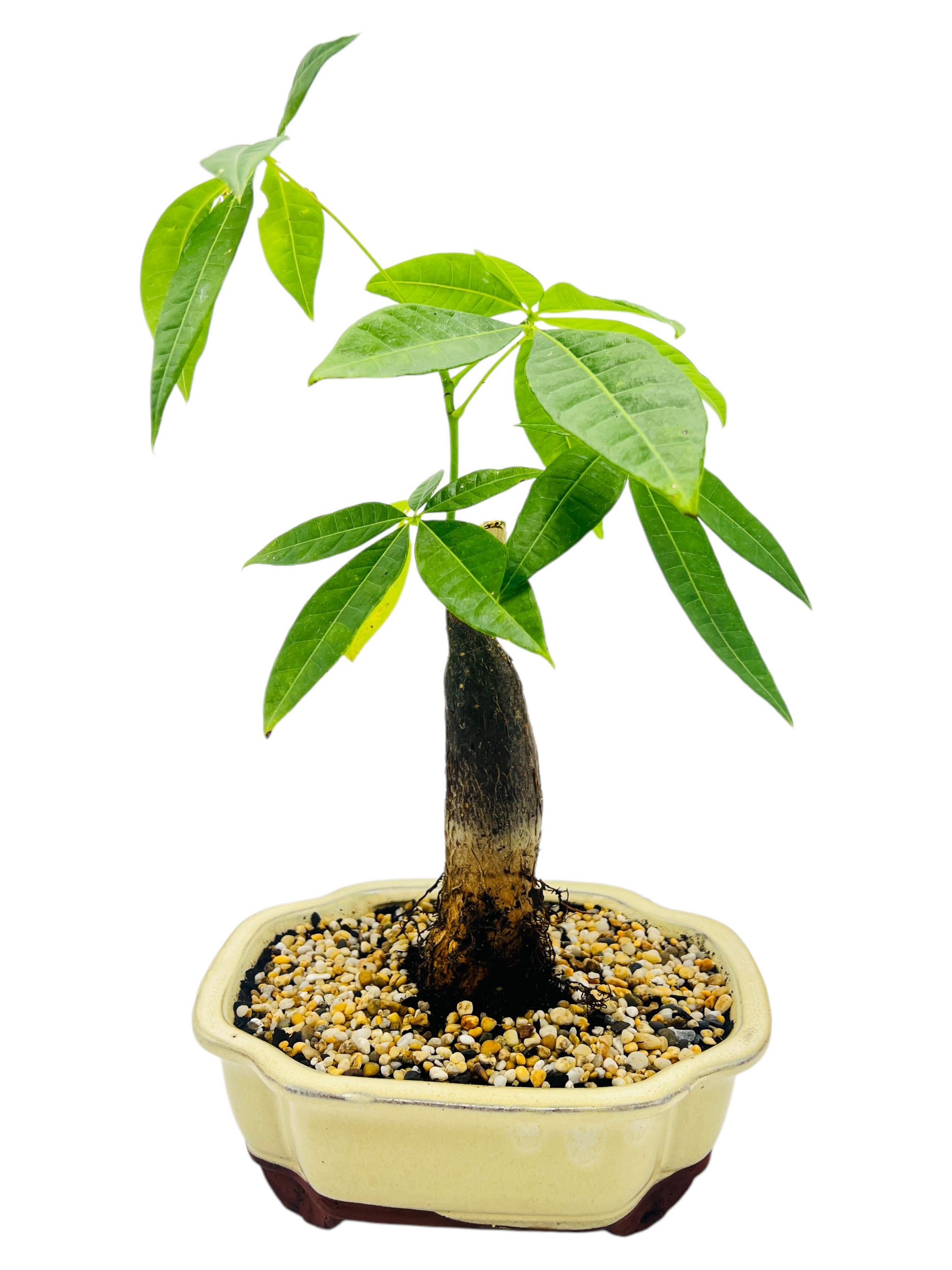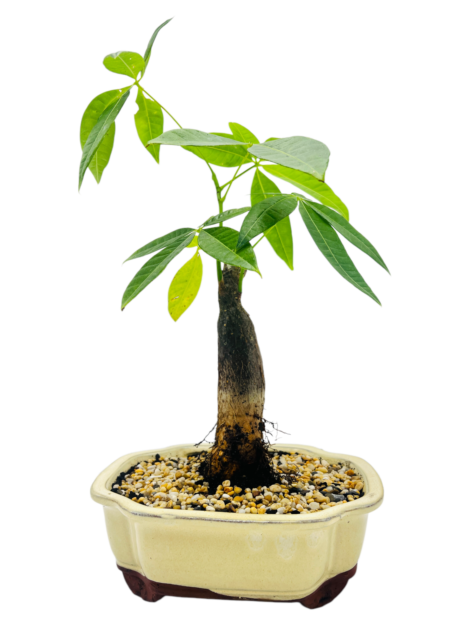 “Pachira Aquatica” Bonsai Tree in a green pot, also known as Chestnut Money Tree, Guiana Chestnut, Malabar Chestnut or 发财树.