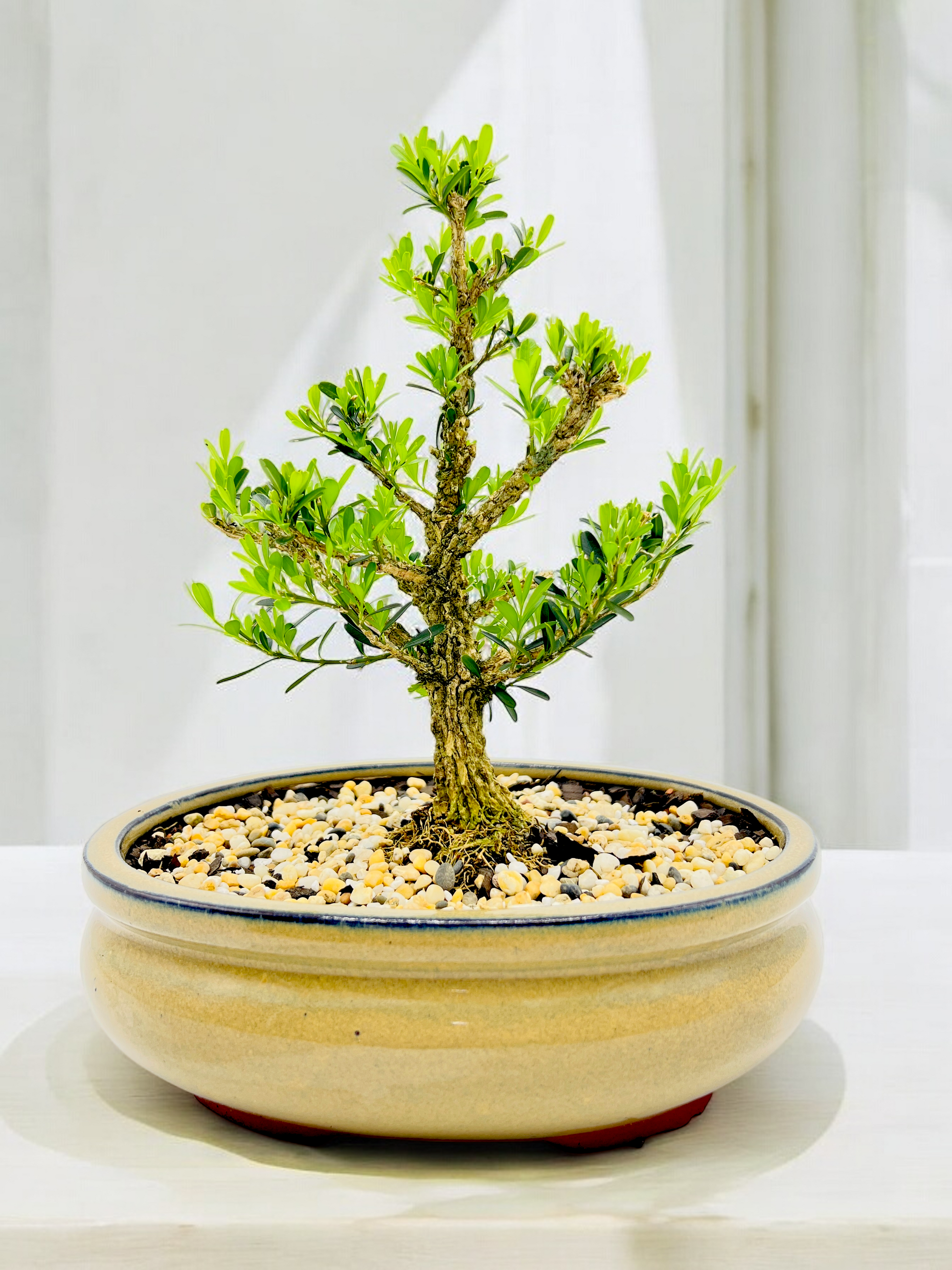 Harlandii Buxus is a unique species of traditional bonsai. It is known for its yellow flowers when in bloom, making it a beautiful addition to any home or garden. This 8' sample is a perfect size for any bonsai enthusiast.
