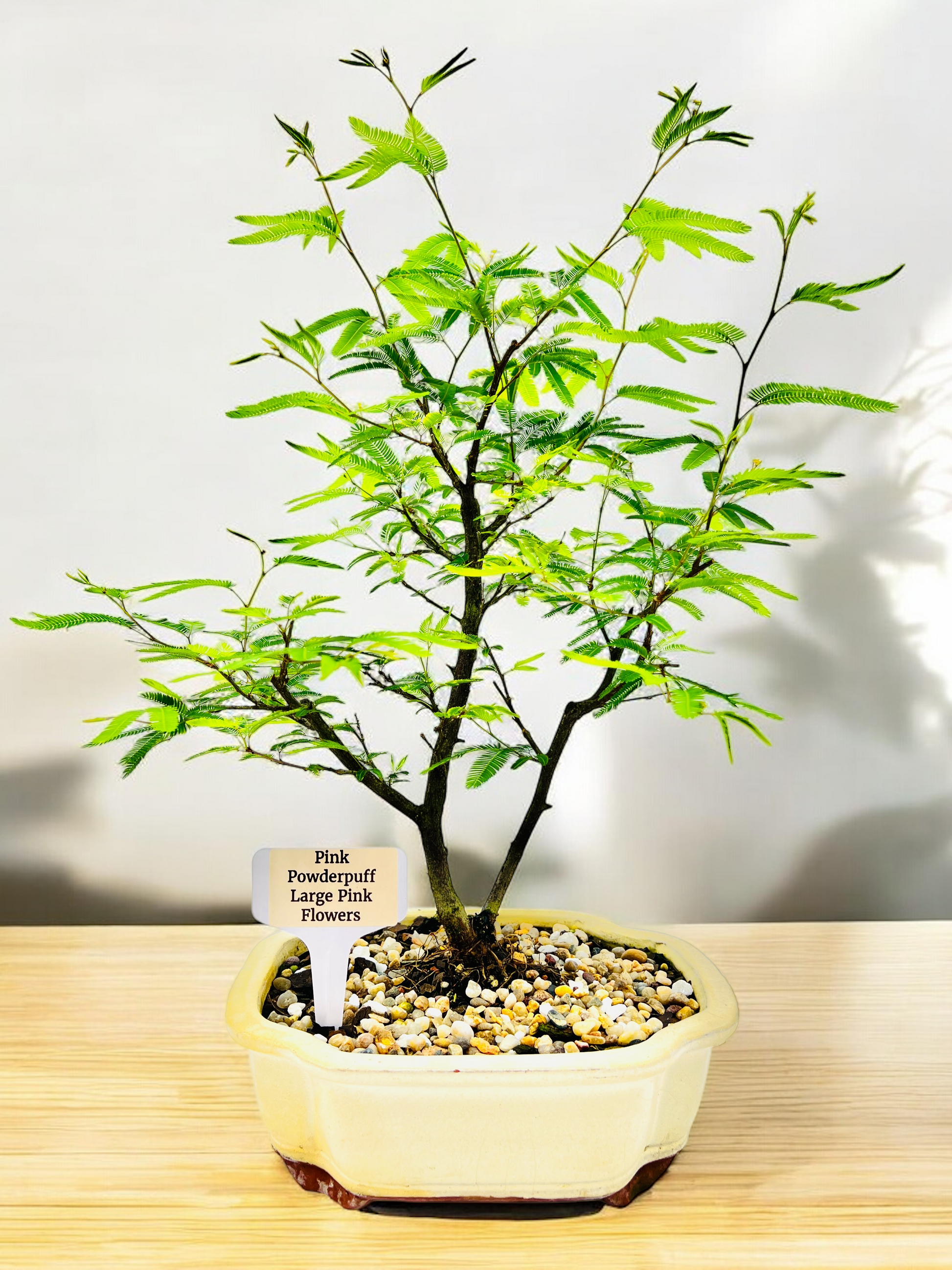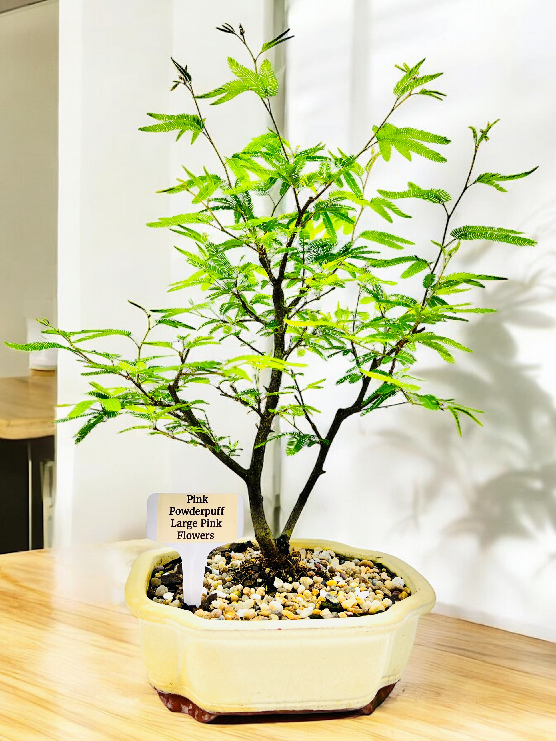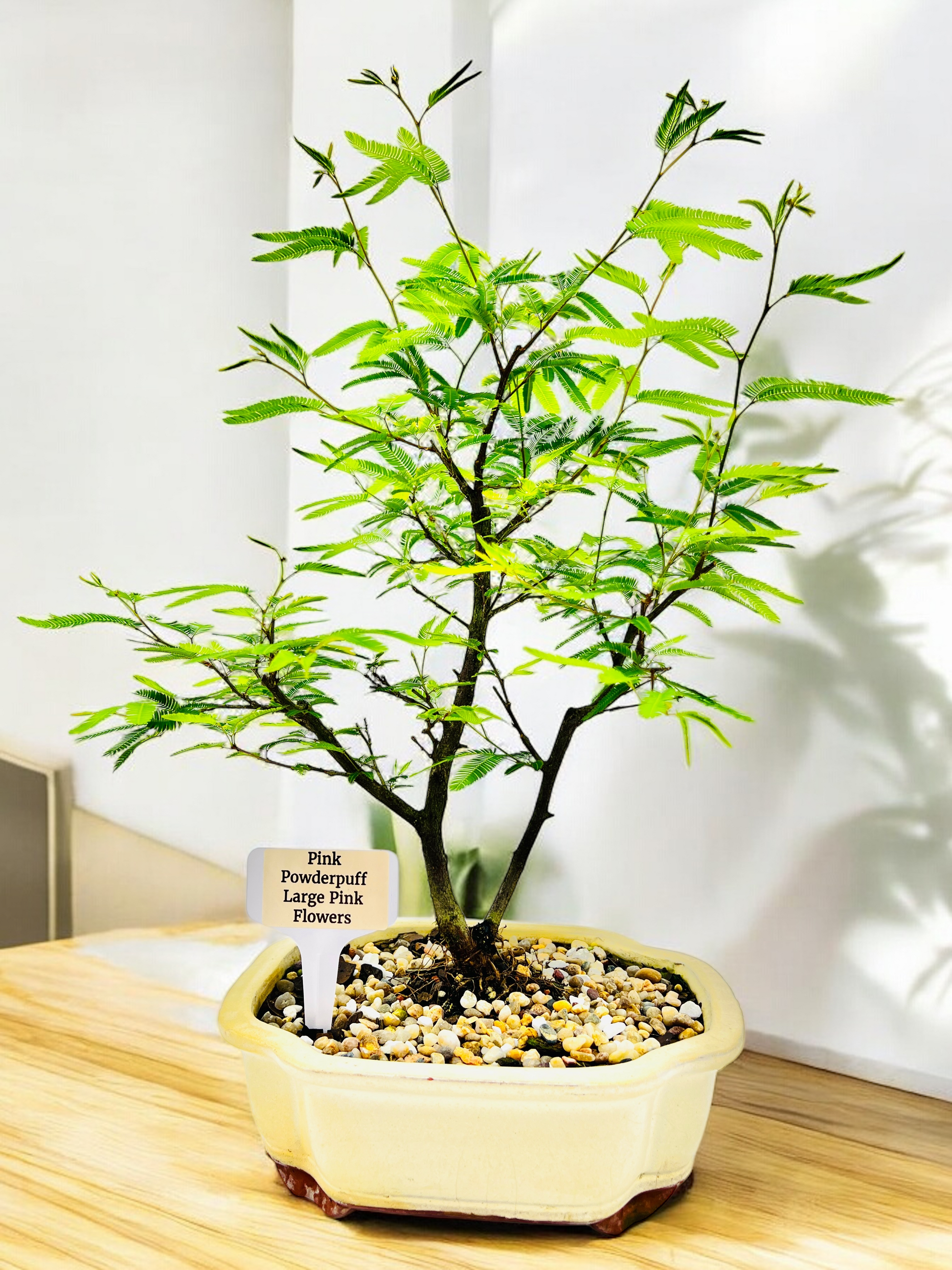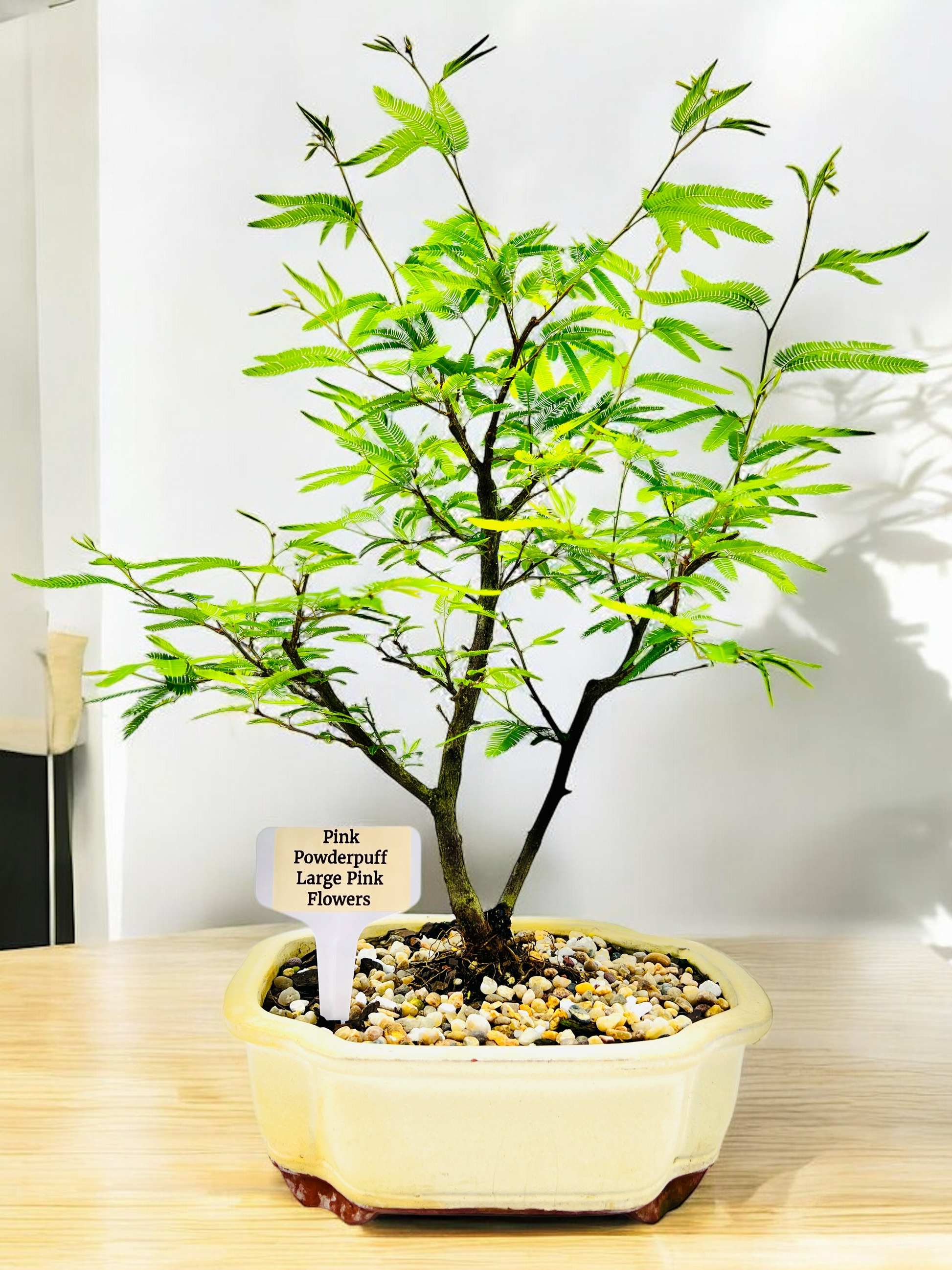 White glazed pot, Pink Powderpuff Bonsai Tree.